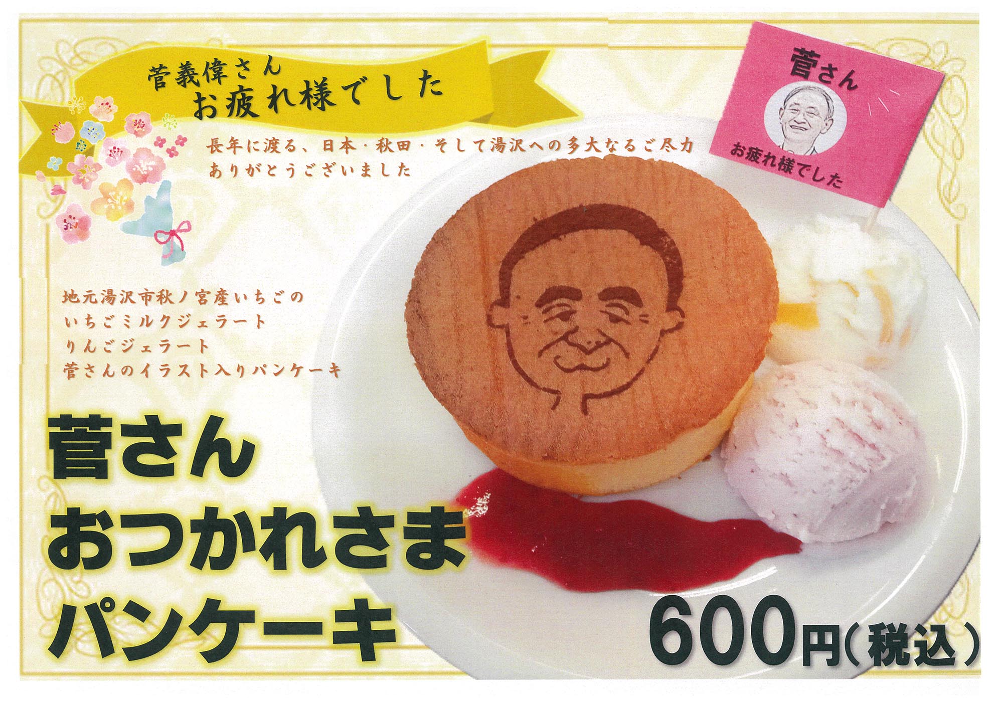 甘党として知られ、なかでもパンケーキを好まれた菅氏。そんな彼の似顔絵をあしらった「パンケーキ」に「りんごジェラート」、地元湯沢市秋ノ宮産いちごを使用した「いちごミルクジェラート」の組み合わせた「菅さんおつかれさまパンケーキ」は600円(税込)にて提供しています。ぜひこの機会にカフェ「ボスコ」へお立ち寄りください!