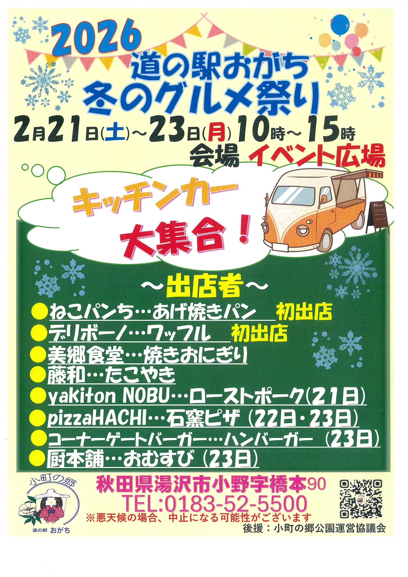 2月の3連休、2月21日(土)〜23日(月・祝)は「2026 道の駅おがち 冬のグルメ祭り」が開催されます! イベント広場にキッチンカーが大集合、時間は10時〜15時となっております。