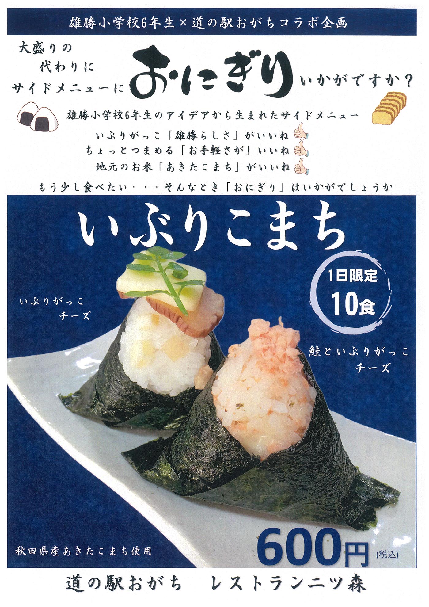 道の駅おがちでは団体様向けのお弁当も提供しており、その名も「秋田道の駅弁当」! 秋田の食材をふんだんに使った贅沢なお弁当は「店内お召し上がり弁当」と「積み込み弁当」の2種類ご用意しております。「店内お召し上がり弁当」は2階レストランでゆったりとお召し上がりいただけるお弁当。ご飯・お漬物・味噌汁付きが1,600円(税込)、ご飯・お漬物・稲庭うどん付きが1,700円(税込)となっております。「積み込み弁当」はお持ち帰りや車載用としてご利用いただけるお弁当でお値段は1,400円(税込)です。どちらも団体様向けのため、ご予約が必要となっております。お電話はTEL.0183-52-5500までお願いいたします。皆さんでワイワイと、ちょっとリッチなお弁当、行楽のお供にぜひいかがでしょうか? 団体様も道の駅おがち「小町の郷」へぜひお越しくださいませ!