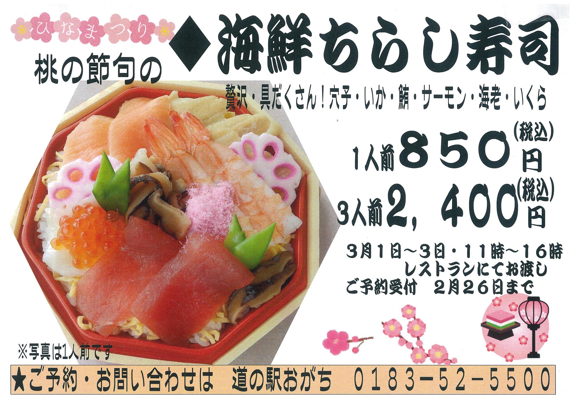 レストランでは3月3日の「桃の節句」にオススメの「海鮮ちらし寿司(1人前850円・3人前2,400円/共に税込)」のご予約を受け付けております。